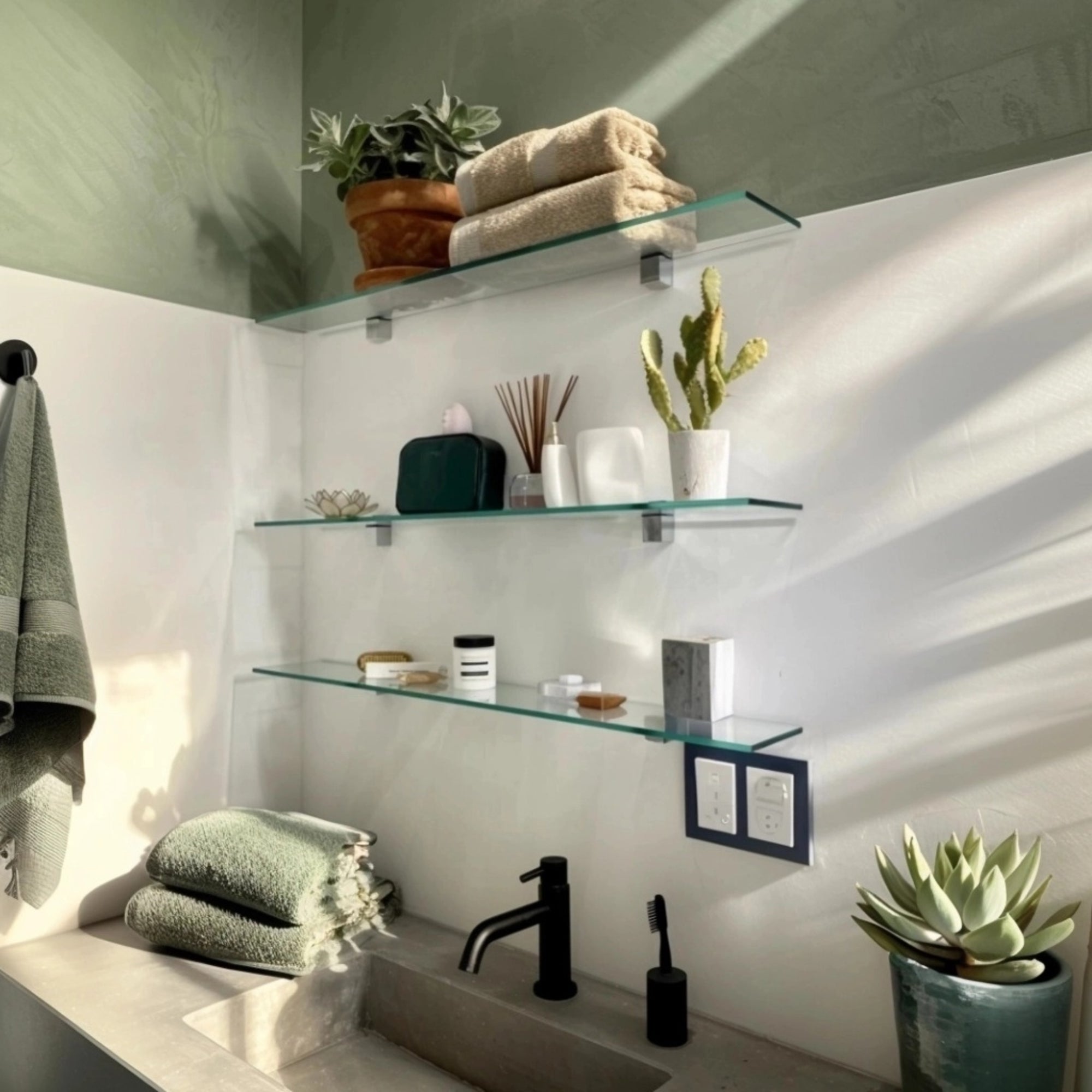 Ob im Bad für Zahnbürsten & Pflegeprodukte oder in der Küche für Gewürze & Ölflaschen – dieses Glasregal bringt stilvolle Ordnung in jeden Raum.