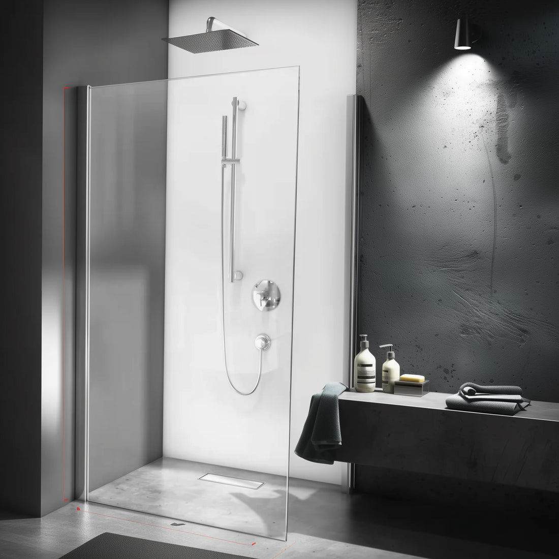 Zusammenfassend Vergleich 140 vs 110 cm Walk In Duschwand Platzangebot: Die 140 cm Duschwand bietet mehr Bewegungsfreiheit und Komfort, ideal für größere Badezimmer. Die 110 cm Variante ist kompakter und passt besser in kleinere Räume. Montage und Handhabung: Die 110 cm Walk In Dusche ist leichter zu transportieren und einfacher zu montieren, wodurch das Risiko von Beschädigungen beim Einbau geringer ist. Preis: In der Regel ist die 110 cm Variante kostengünstiger, ohne dabei an Funktionalität einzubüßen. Schutz vor Spritzwasser: Beide Größen schützen effektiv vor Spritzwasser und halten das Badezimmer trocken. Material und Reinigung: Beide Varianten sind häufig aus 8 mm ESG-Sicherheitsglas gefertigt und verfügen über Nano-Beschichtungen, die die Reinigung erleichtern und die Duschwand lange klar halten. Risiko von Glasbruch: Bei der 140 cm Walk In Dusche ist das Risiko eines Glasbruchs deutlich höher, da das größere Glas schwerer zu handhaben ist und mehr Belastung ausgesetzt sein kann. Die 110 cm Variante bietet hier mehr Sicherheit durch geringeres Bruchrisiko.